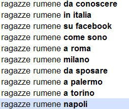 Lo sapevate che molti italiani ricercano su Internet ragazze straniere da poter conoscere, sposare o con cui semplicemente chattare su FACEBOOK ? Non ci credete ? Guardate i suggerimenti che il motore di ricerca GOOGLE offre al pubblico inserendo la frase „RAGAZZE RUMENE”: